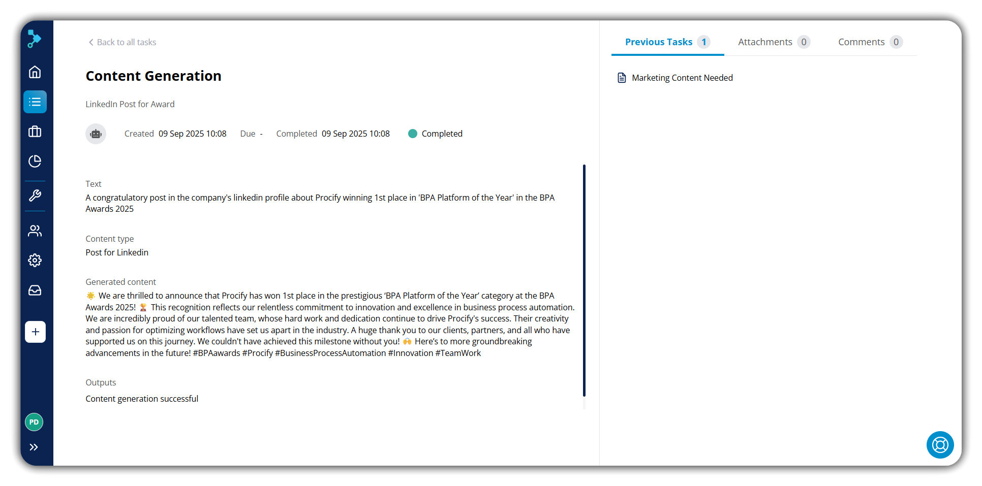 During execution, when the workflow reaches the GenAI Content Generation task, the system takes your inputs and creates a piece of text tailored to your needs.